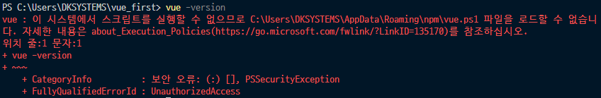 vue : 이 시스템에서 스크립트를 실행할 수 없으므로 vue.ps1 파일을 로드할 수 없습니다. 자세한 내용은 about_Execution_Policies를 참조하십시오.